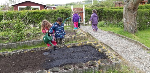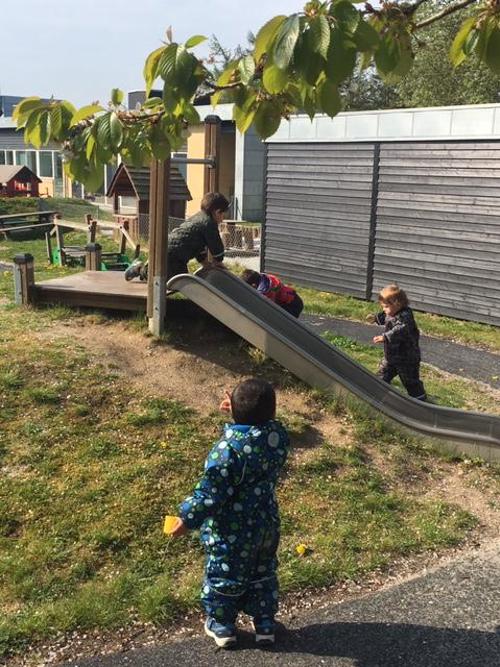 Vi opholder os meget på vores store og inspirerende legeplads hvor børnene laver mad i vores bålhytte i skoven, leger fangeleg på forhindringsbanen, finder smådyr i vores insekthoteller, spiller bold på multibanen, hjælper med at plante blomster og krydderurter i vores plantekasser, gynger, klatre i træer, mooncar ræs på cykelbanen eller andre sjove lege. Vuggestuen har 3 ladcykler, så vi er tit på tur ud i det blå.